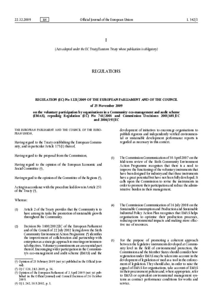 EMAS Regulation (EC) No 1221/2009 of the European Parliament and the Council