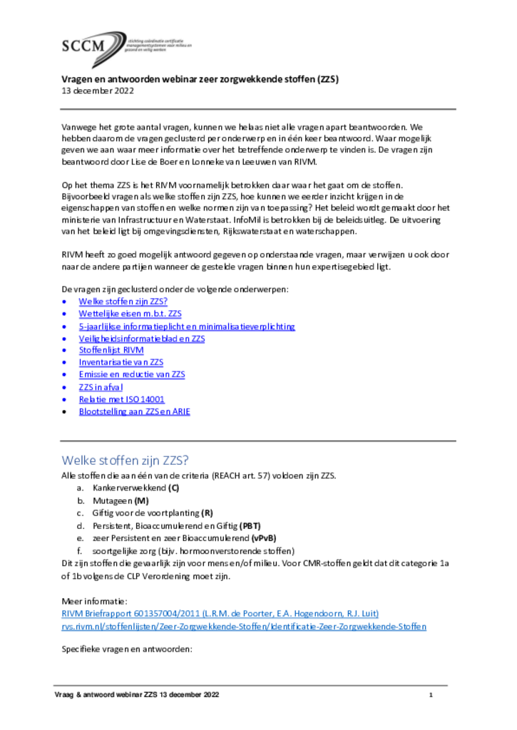 Webinar Zeer Zorgwekkende Stoffen (ZZS) - vragen en antwoorden