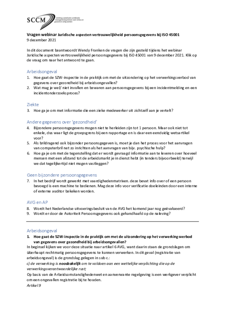 Webinar Juridische aspecten van vertrouwelijkheid persoonsgegevens bij ISO 45001 - vragen en antwoorden